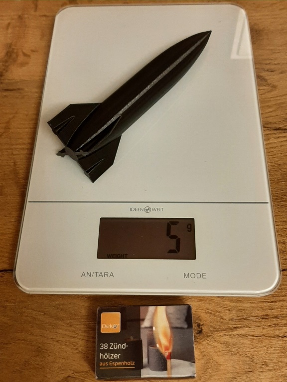 Das könnte ich noch unterbieten, wenn auch nur in konventioneller Bauweise, d. h. Pappe und Balsa. Hab's aber noch nicht geflogen. Bei den letzten Flugtagen war zuviel Wind. Ist sowieso die Gefahr, dass es zu einer "Ex-und-Hopp"-Rakete wird. Gruß Achim